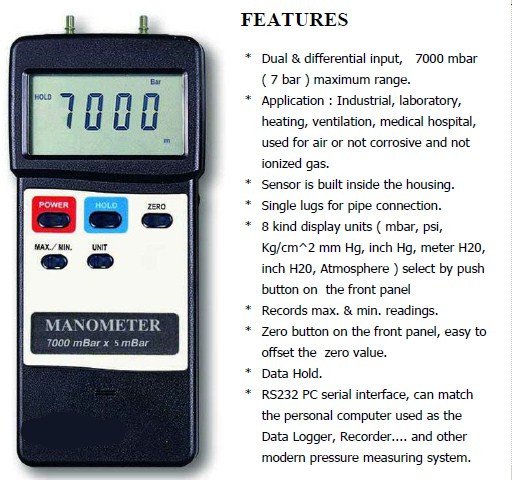 Dual & differential input, 7000 mbar ( 7 bar ) maximum range. * Application : Industrial, laboratory, heating, ventilation, medical hospital, used for air or not corrosive and not ionized gas & liquid. * Sensor is built inside the housing. * Single lugs for pipe connection.