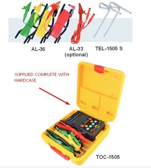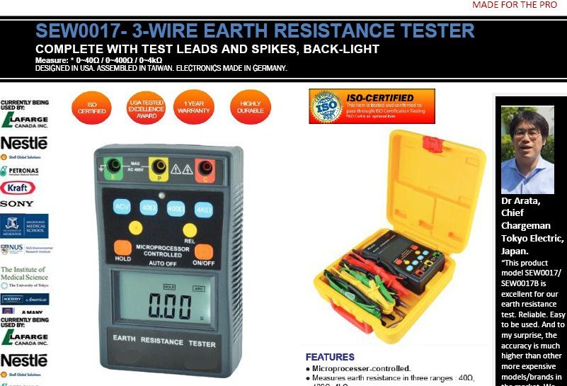 ● Microprocesser-controlled. ● Measures earth resistance in three ranges : 40Ω, 400Ω, 4kΩ. ● Capable of measuring earth voltage. ● ¾ digit (4000 counts). ● LCD backlight display. ● 2mA measuring current permits the testing of earth resistance without tripping earth leakage current breakers in the circuit. ● Data hold function. ● Relative function. ● Auto power-off function. ● Low battery indication. ● Calibration performed with supplied test leads.